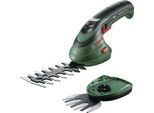 Das Bosch DIY Akku Gras- und Strauchscheren Set Isio besteht aus einem Akku, dem Ladegerät, einem Grasschermesser und einem Strauchscherenmesser. Zudem wird ein Softcase sowie ein Messerschutz mitgeliefert.